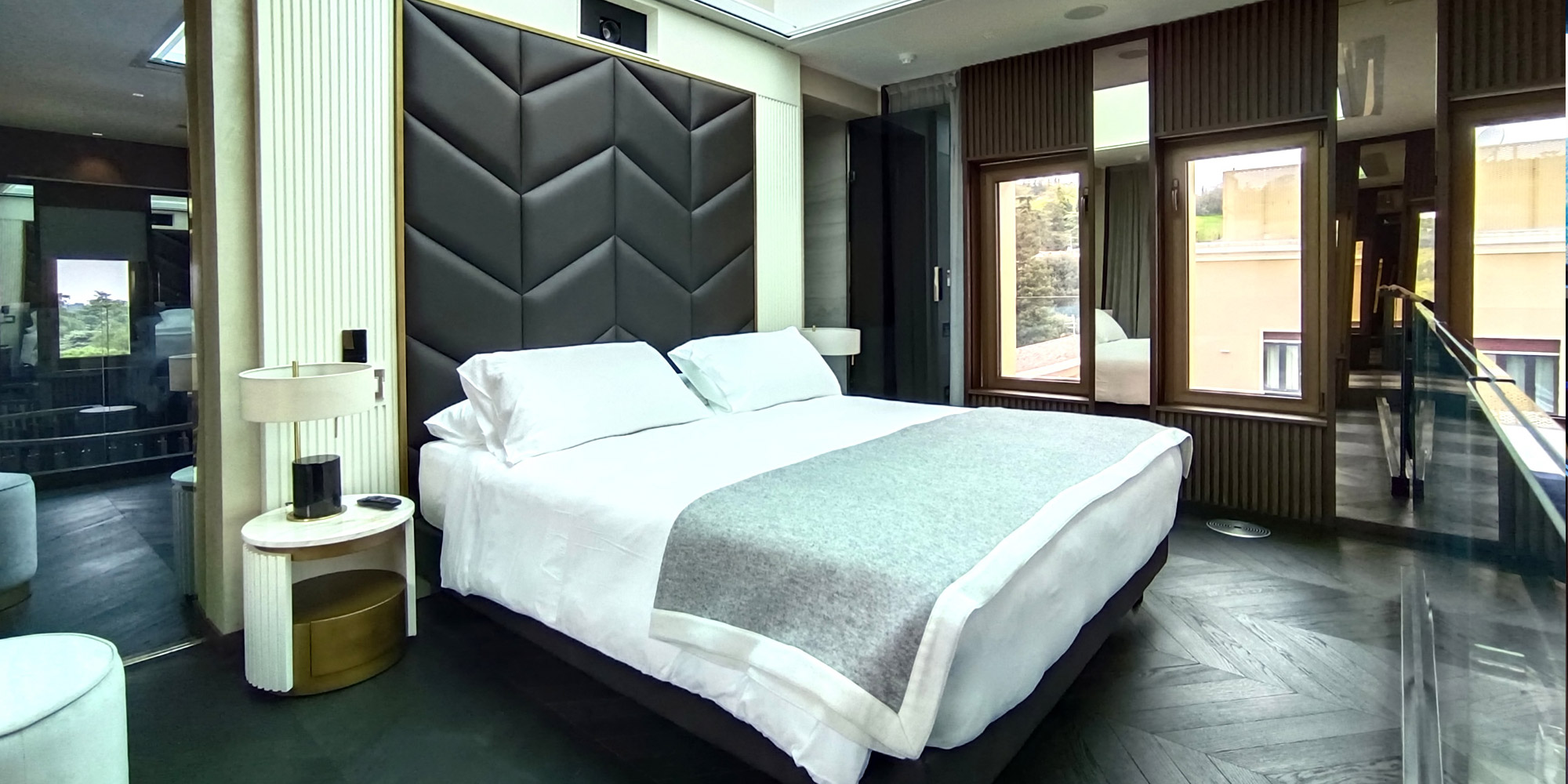 Il Piano superiore si raggiunge dopo aver percorso una scala a chiocciola ed è composto da una camera con letto matrimoniale king size con materasso memory su soppalco, un bagno con doccia a vista, una piccola scrivania, un divanetto e una Sky TV è proiettata sulla parete.